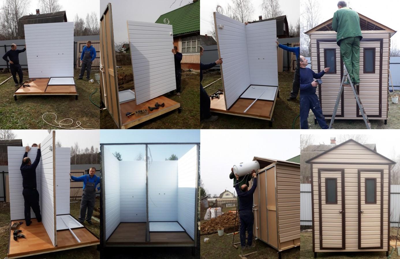 Основание и комплект стен закрепляются на вкрученные электромеханическим (сваекрутом) способом сваи. Затем устанавливается кровля, а сантехника монтируется по заранее подготовленным местам крепления. Сантехника подключается через проточный фильтр к внутренней системе раздачи воды, выполненной из полипропиленовых труб, фильтр необходим для продления срока службы бойлера. При заборе воды из колодца устанавливается комплект автоподачи, входящий в заказ, который позволяет в дальнейшем самостоятельно выполнить разводку ко всем объектам потребления на участке.